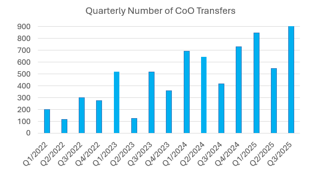 The number of transfers dropped in the third quarter of 2024. It is not yet sure what role the move to the new IT system played in this drop and what is the impact of changes in the market. Furthermore, the move to the new IT system caused some issues with the data collection. Therefore, the numbers are not accurate, and some numbers might be corrected later. In any case, all transfers are still going to the dena biogas registry in Germany.
