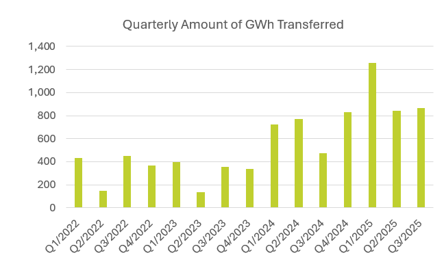 The number of transfers totalled more than 202 (as opposed to 11 in Q4 of 2021), while the amount transferred was 433 GWh (compared to 30 GWh in Q4 of 2021).